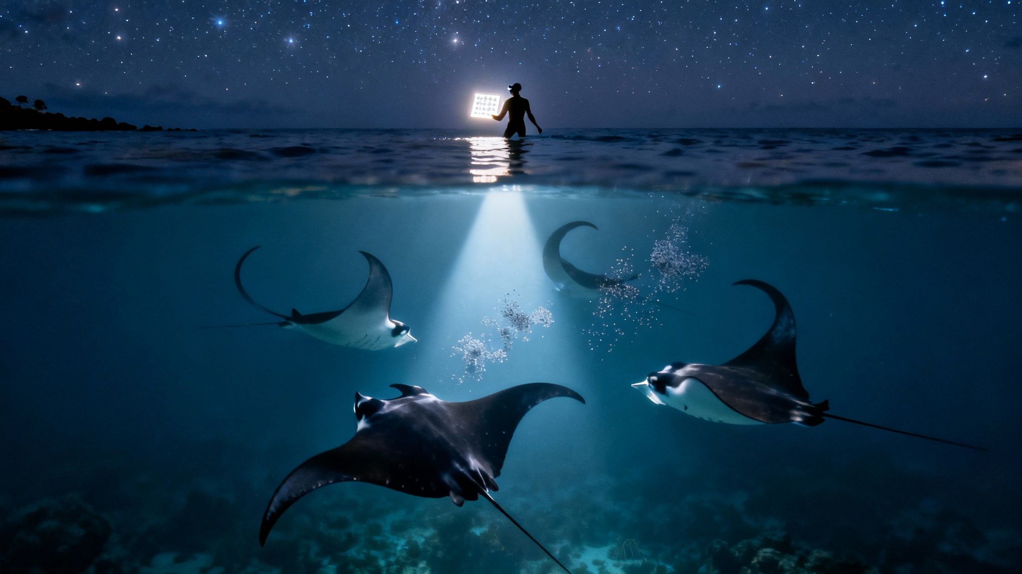 What you see in the water is pure magic. As plankton swarms in the light beams, the manta rays glide in from the darkness to feast. These gentle giants, often called "ocean ballerinas," perform a graceful, acrobatic dance as they filter the tiny organisms from the water.
