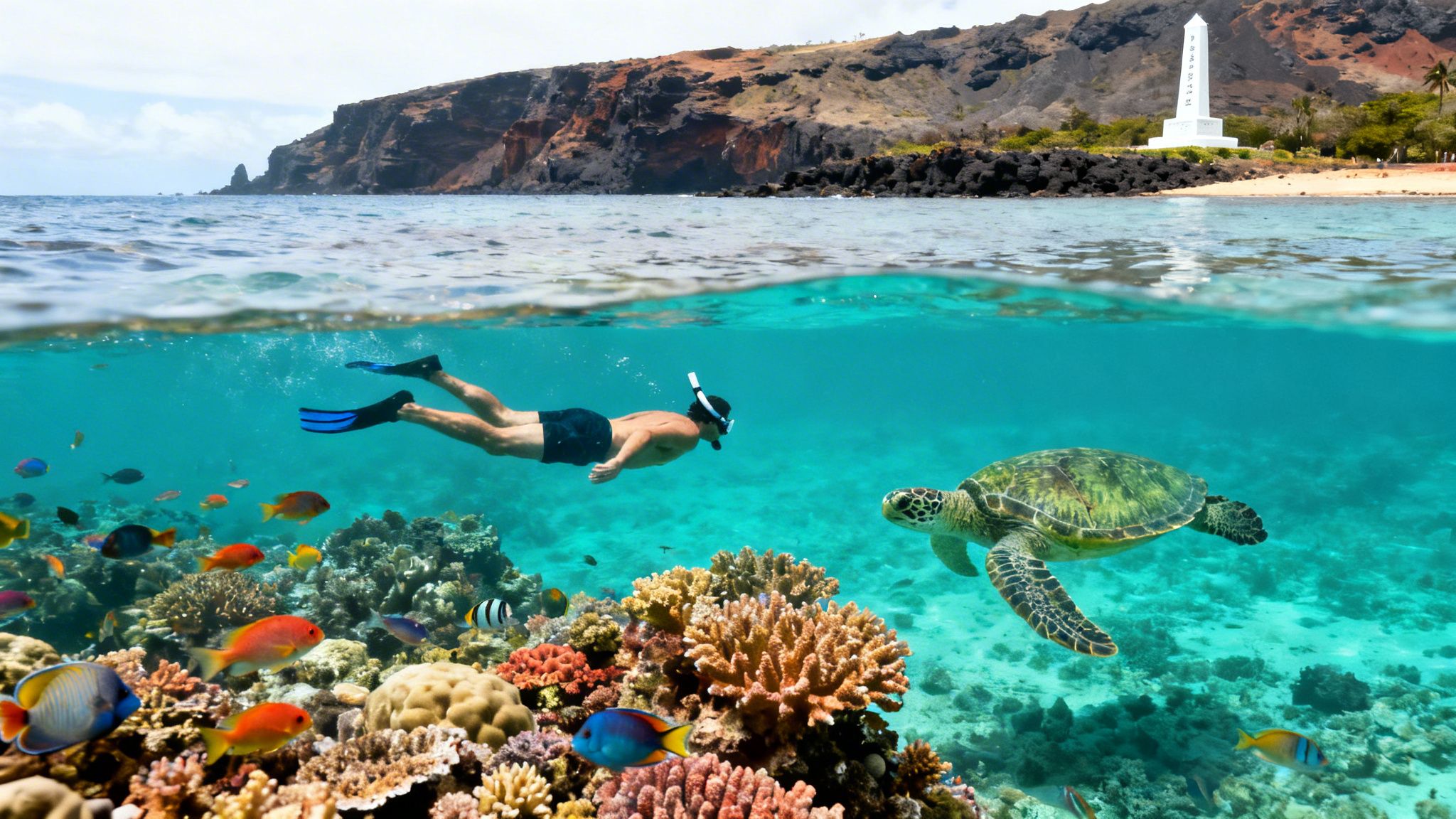 The 27-foot Captain Cook Monument is a National Historic Landmark that marks the general area of Cook’s death. Seeing it from the water while you snorkel really adds a powerful sense of history to the whole experience.