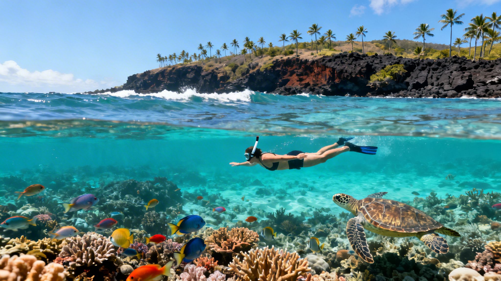 The park’s main draw is its ease of access and safe conditions. With lifeguards on duty and excellent amenities like showers and pavilions, it's the ideal place for families with children or anyone new to snorkeling. The shallow lagoon is teeming with an impressive variety of fish, including butterflyfish, Moorish idols, and humuhumunukunukuāpuaʻa (the state fish). Most notably, Kahaluu is a sanctuary for Hawaiian green sea turtles (honu), which are frequently seen feeding on algae or resting on the rocks, offering incredible, respectful viewing opportunities. You can find out more about excellent Kona snorkeling locations by checking out our comprehensive guide to snorkeling in Kona.