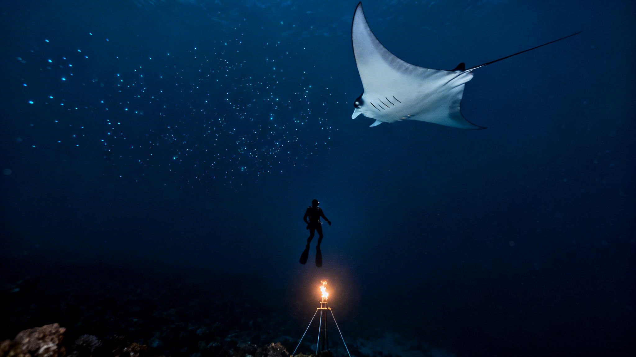 We often describe it like sitting around an "underwater campfire." The divers are the audience, the light is the fire, and the mantas are the captivating performers who always steal the show.