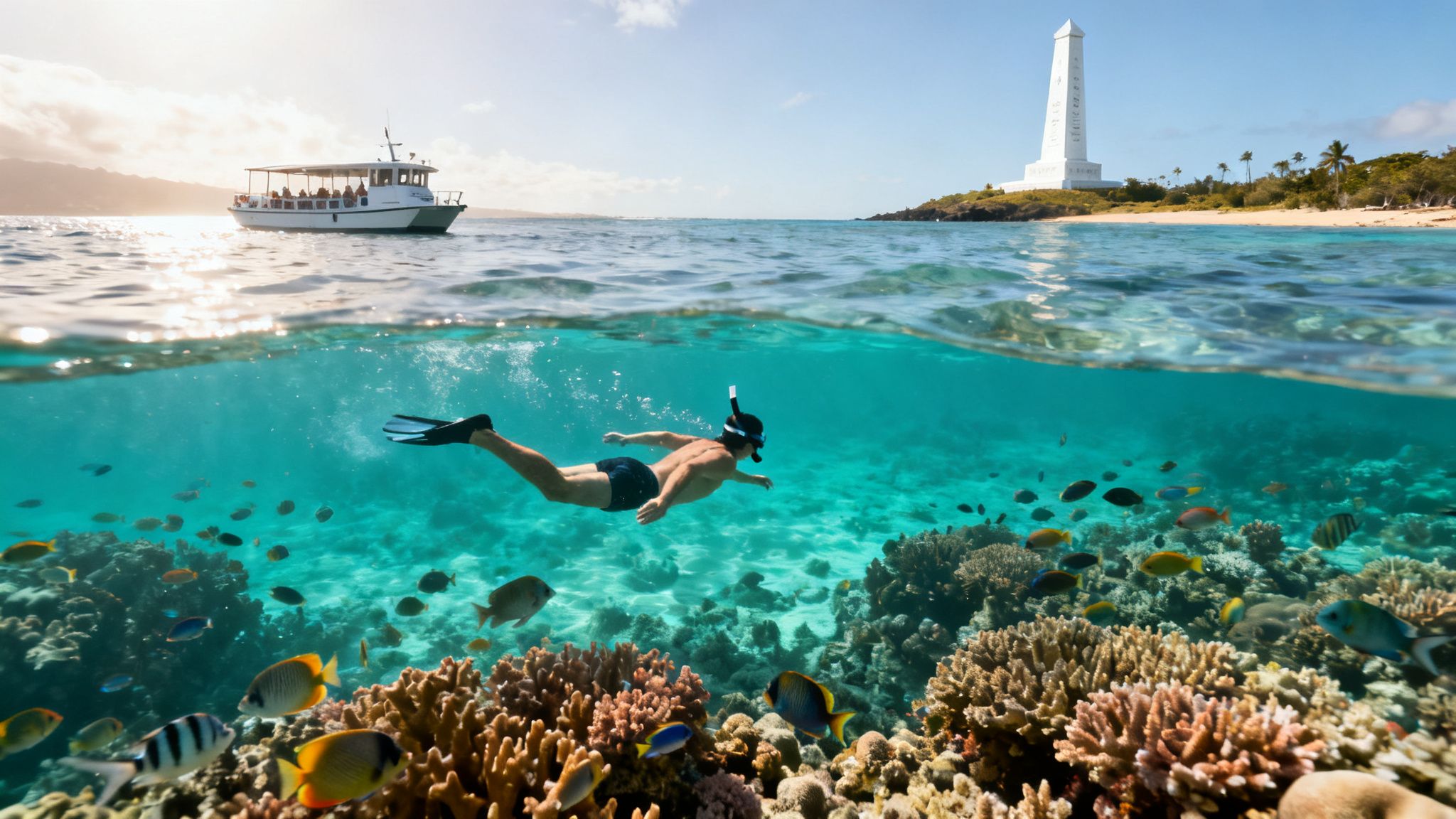 A Captain Cook snorkel tour doesn't just put you face-to-face with vibrant fish; it places you right in the middle of this historical crossroads. The centerpiece of it all is the striking, 27-foot white obelisk standing sentinel on the shoreline—the Captain Cook Monument. It marks a place of immense significance, one you can only truly appreciate from the water.