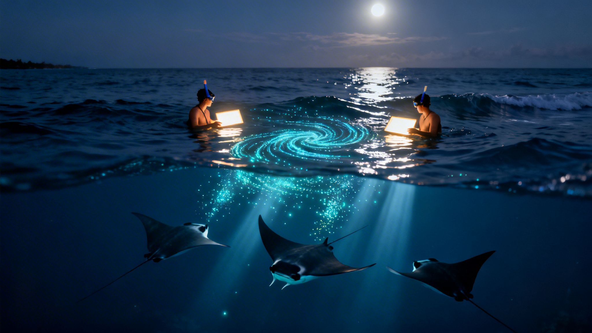 As the plankton swarm to the light, the manta rays show up for an easy, all-you-can-eat buffet. These gentle giants, who are completely harmless to people, perform graceful barrel rolls and swoops as they filter-feed on the feast. You get a front-row seat to the whole show, often getting within inches of these majestic animals.