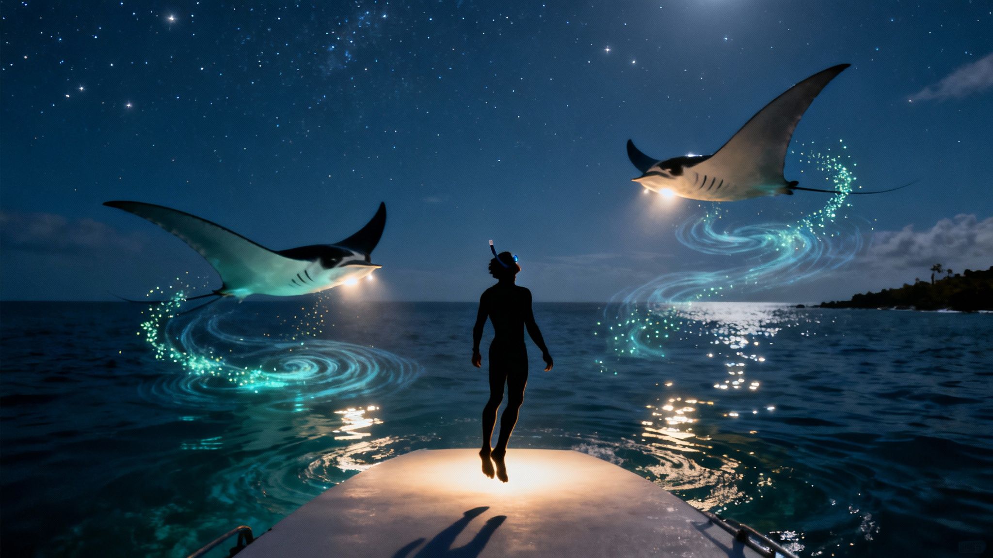 Picture this: you're floating weightlessly in the calm, dark Hawaiian ocean. Just inches below, giant, graceful manta rays with wingspans reaching up to 16 feet glide and somersault in an otherworldly dance.