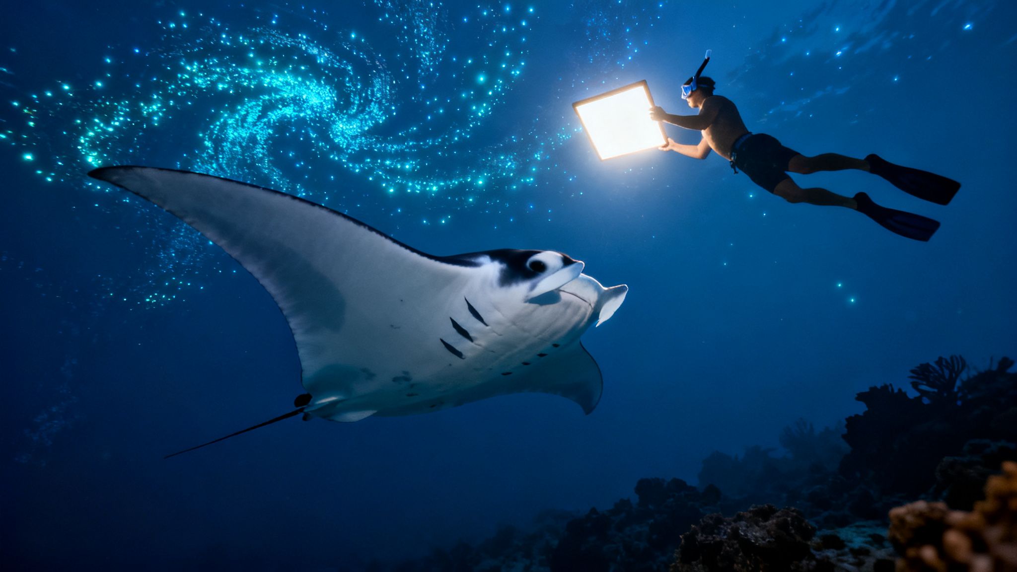 From the sandy bottom, you get to watch these majestic giants dance in the water above you, silhouetted by the bright lights from the snorkel rafts. Seeing their massive forms glide right over your head is an awe-inspiring experience that many divers call a true bucket-list moment. If you want to learn more about these amazing animals, we've got an article packed with fun facts about manta rays.