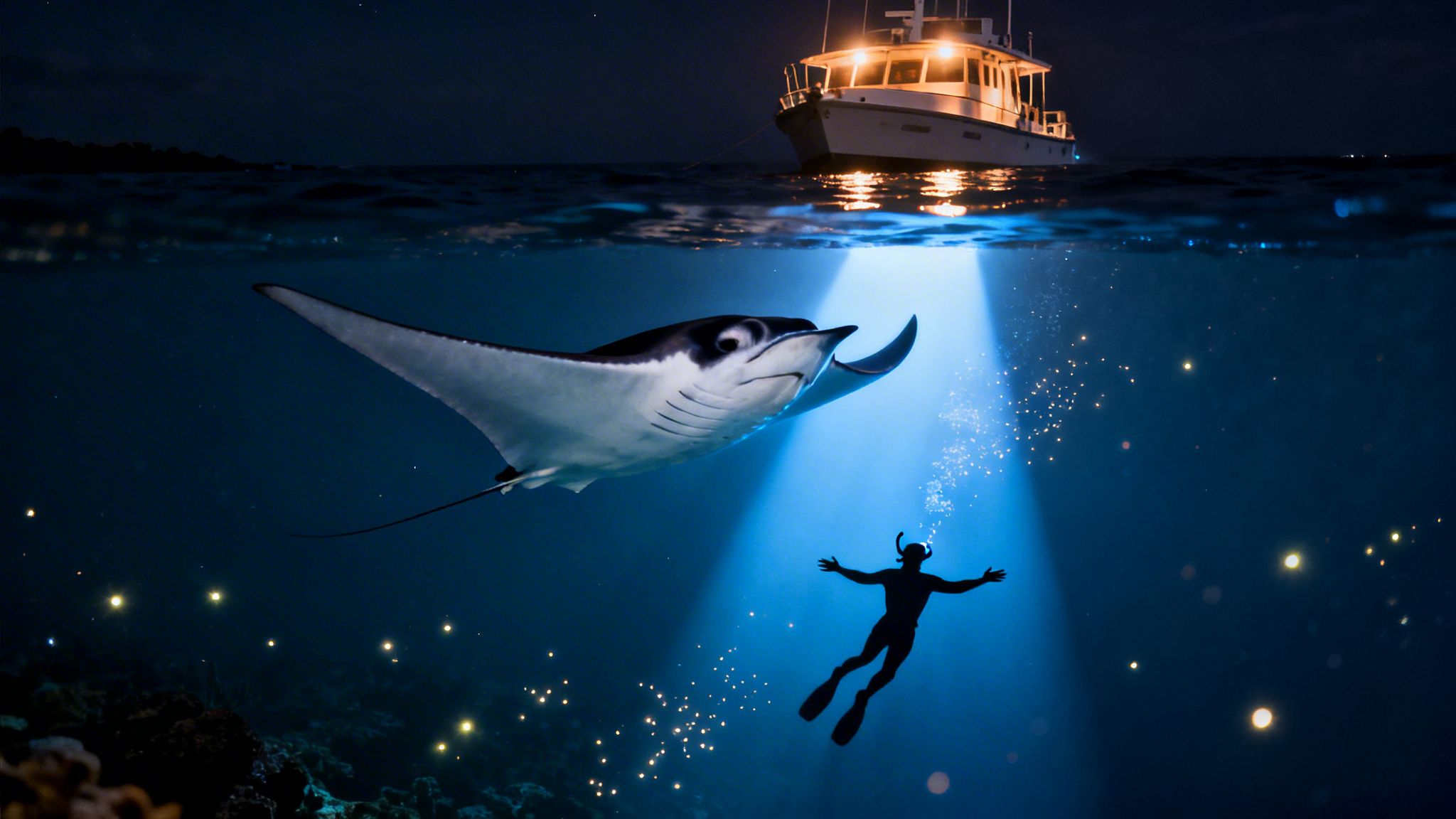 Instead of hovering at the surface, you become part of the underwater scene. The ocean feels quieter. The light beams look stronger. When a manta glides over your mask and rolls into the glow, the moment can feel huge and close in a way that is hard to match from above.