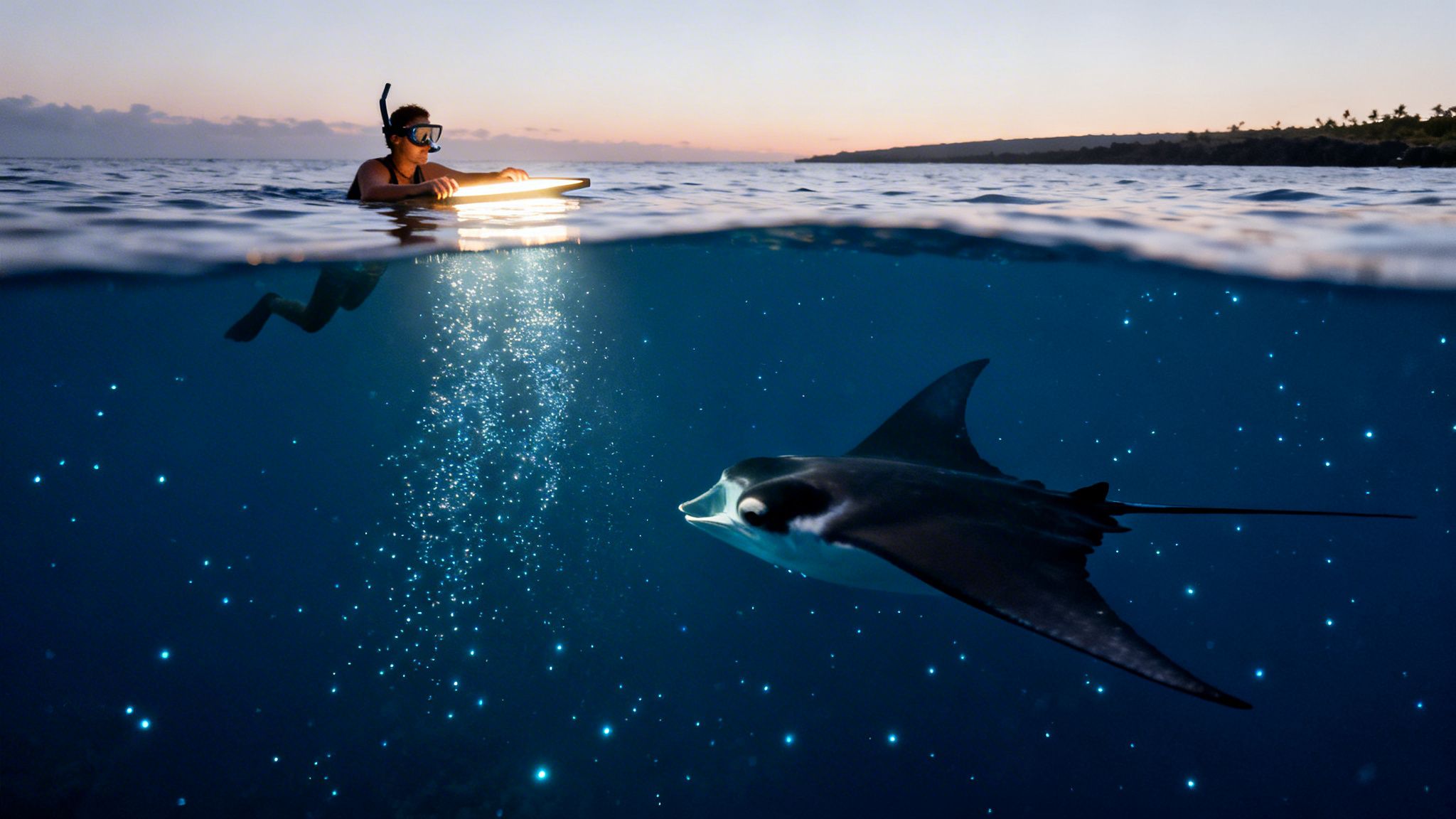 You see, the light attracts clouds of microscopic plankton—the manta rays' favorite meal. It's basically a glowing, all-you-can-eat buffet that the local mantas just can't pass up. You and the other snorkelers will hold onto the board, floating comfortably on the surface while looking down into the bright blue water.