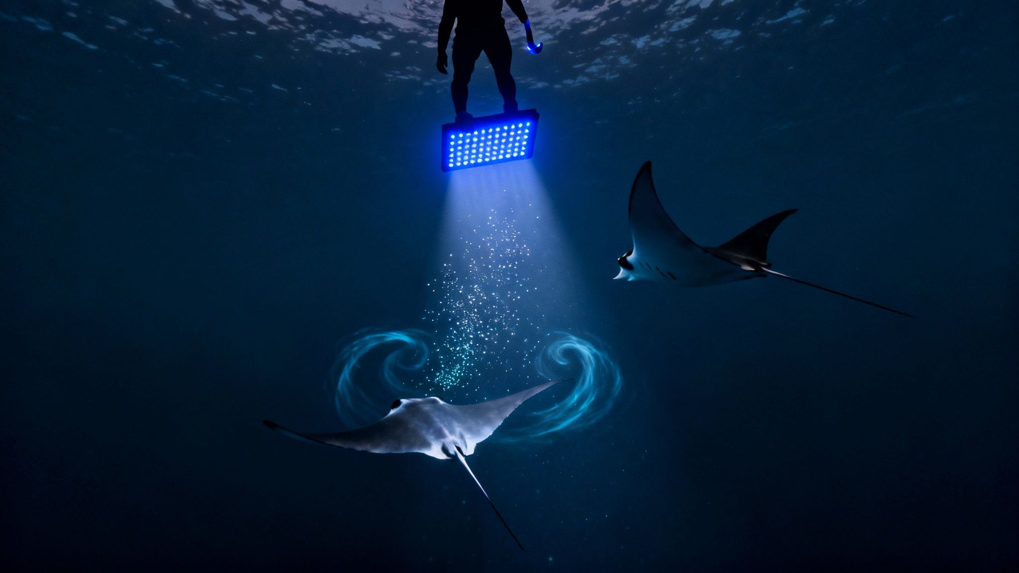We get you into the water and have you hold onto a specially designed light board, making you part of the spectacle. The lights create a glowing cloud of plankton, basically a floating buffet that brings the mantas up from the deep.