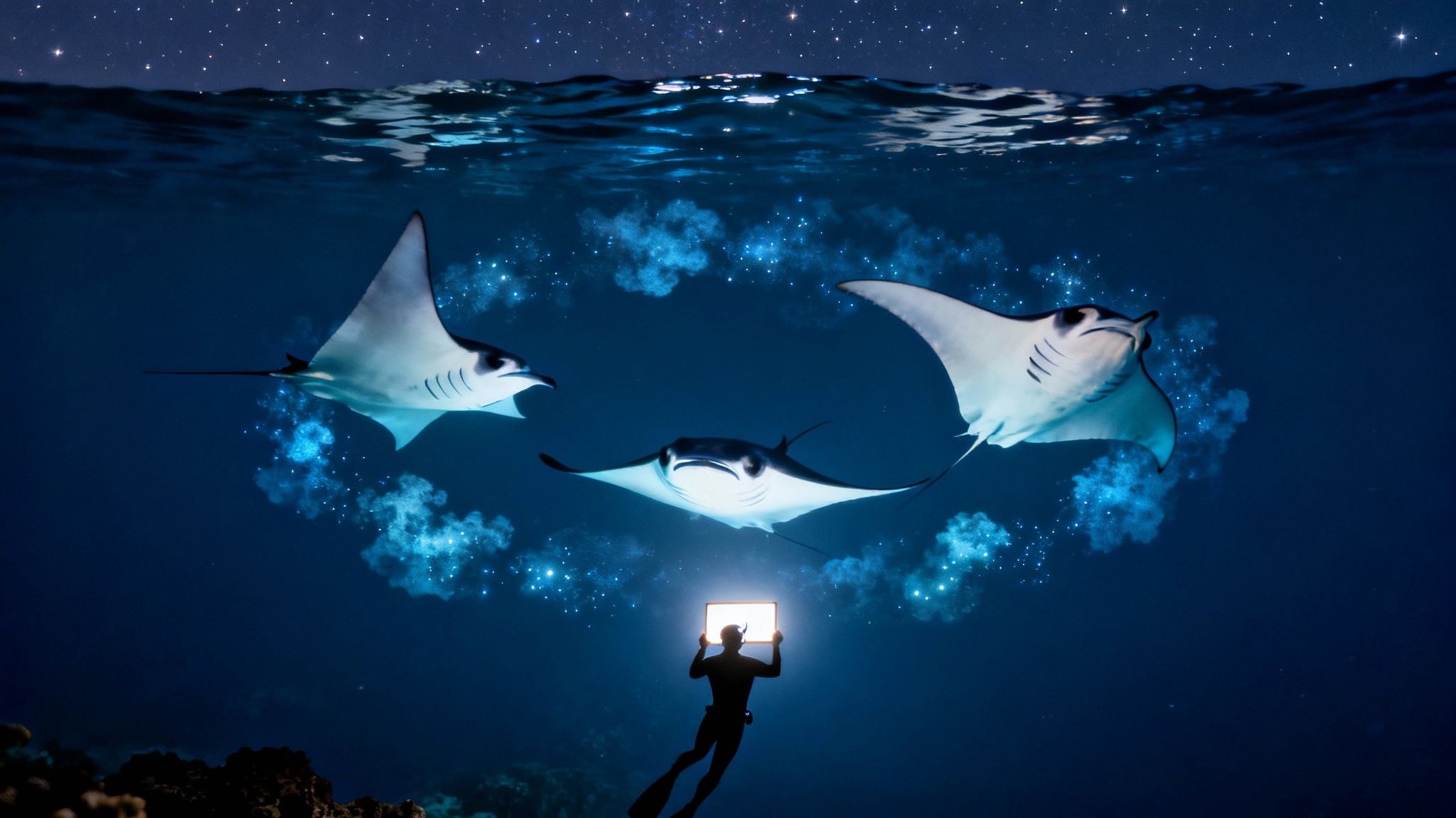 - Using specific lighting techniques that attract plankton without stressing the mantas.