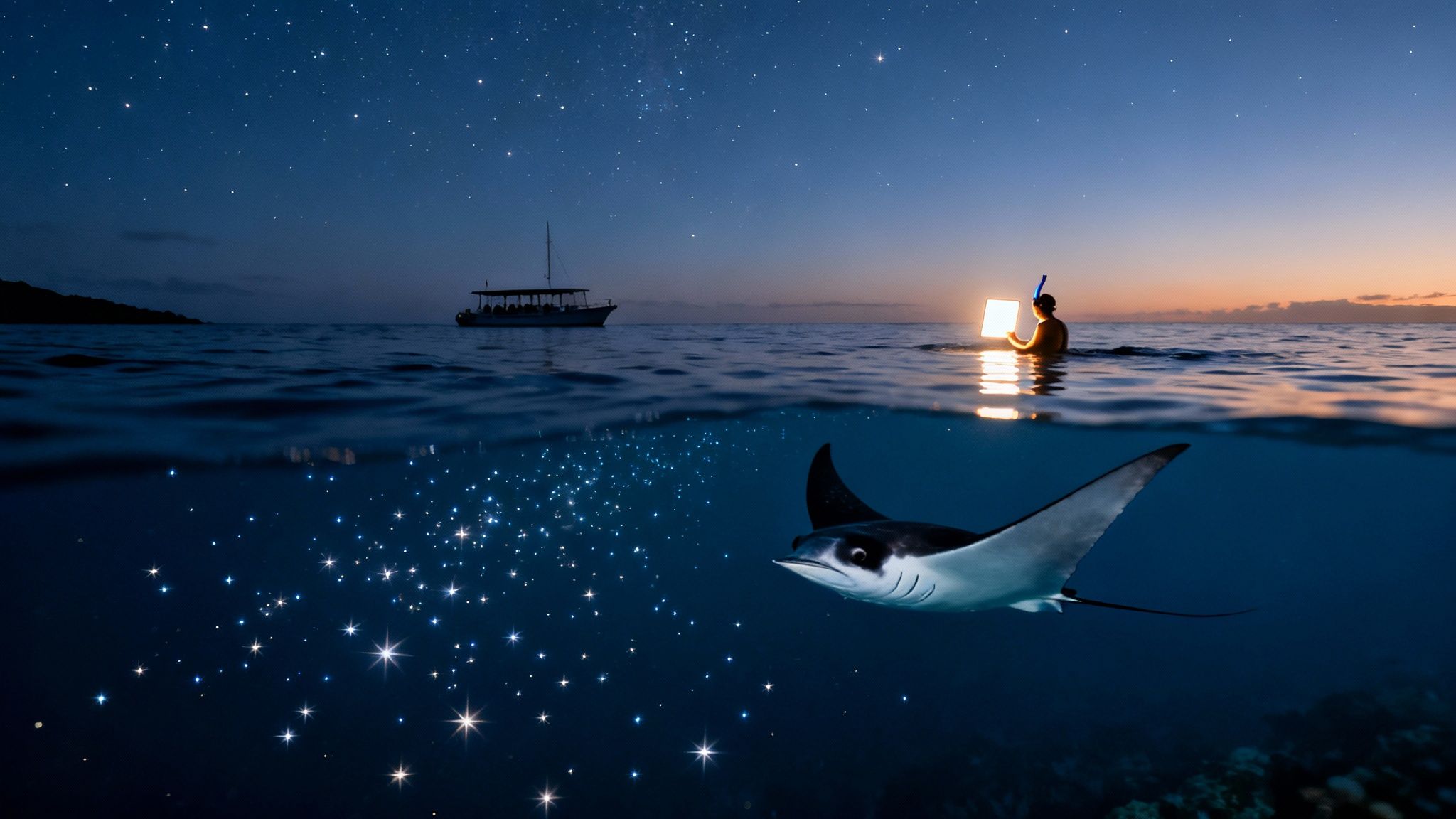 Imagine this: you're floating in the warm, dark Pacific Ocean under a blanket of stars. Below you, massive, gentle manta rays swoop and glide, dancing in beams of light. This isn't a dream. It's the world-famous manta ray night snorkel in Kona, and this guide is your ticket to experiencing one of the planet's most incredible underwater encounters.