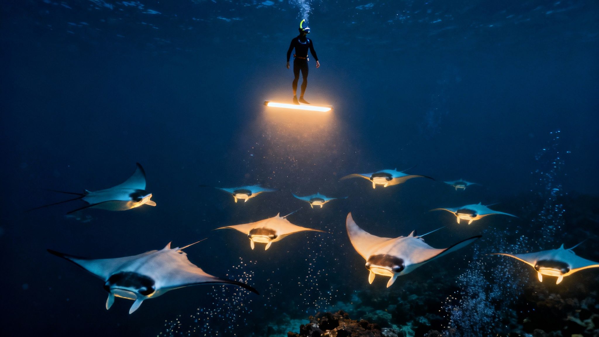 As a snorkeler, you'll hold onto a custom-built light board that floats on the surface. This makes the whole experience pretty much effortless. Just put your face in the water and look down. Through your mask, you'll witness the mantas perform graceful barrel rolls, scooping up plankton with their massive mouths. It's a mesmerizing show that happens so close you can often see the unique spot patterns on their undersides.
