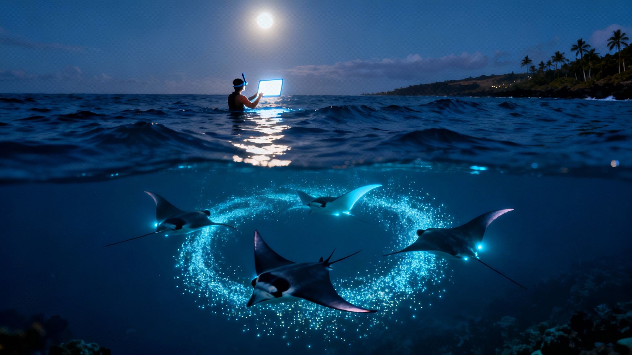 The result is a mesmerizing performance. These graceful creatures, some with wingspans over 12 feet, perform barrel rolls and glide through the illuminated water, often coming within inches of everyone watching.