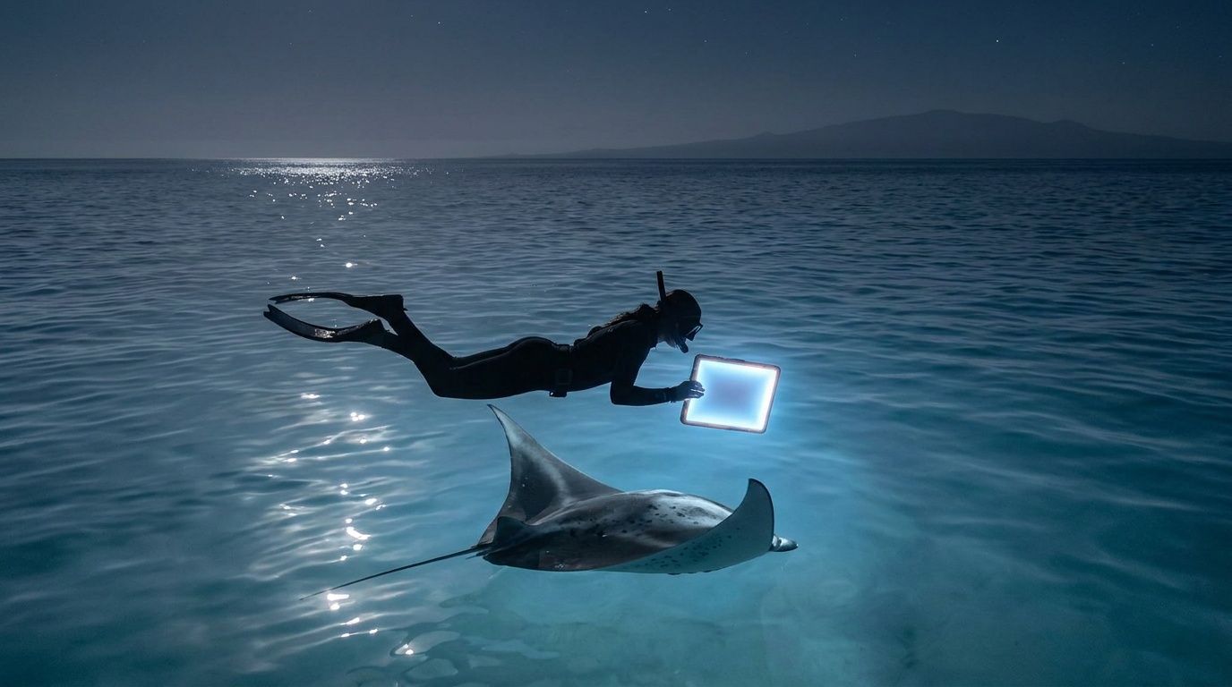 You’re floating on the surface in the dark, face in the water, hands steady on the board. The light below turns the ocean into a glowing stage. Then a shape rises from the black water, wide and silent, and suddenly a manta ray is sweeping underneath you with the kind of control that makes the whole scene feel unreal.
