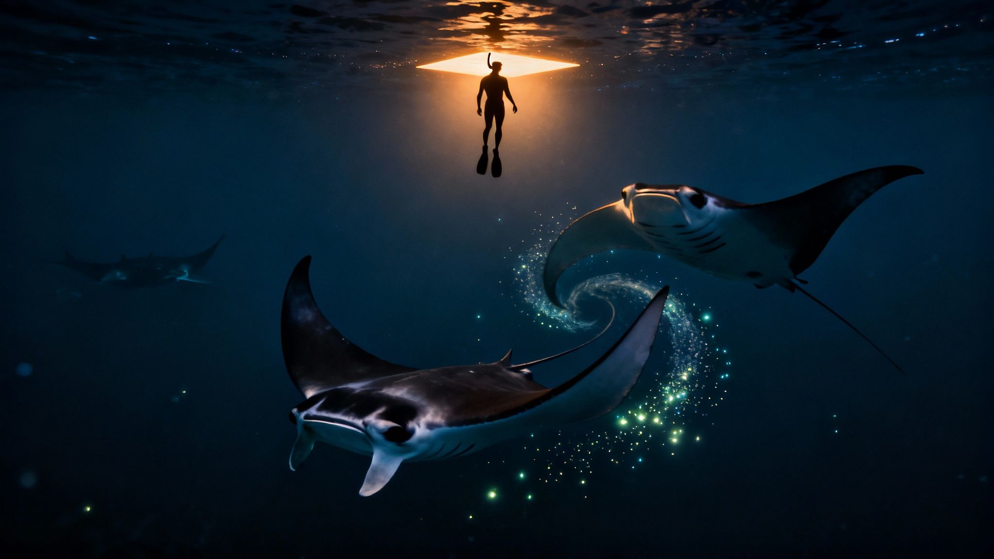 Picture this: you're floating weightlessly on the calm, dark surface of the Pacific, looking down into a world illuminated by soft blue light. Suddenly, a colossal, gentle creature with a wingspan wider than you are tall glides into view, performing an elegant, looping somersault just inches below you.