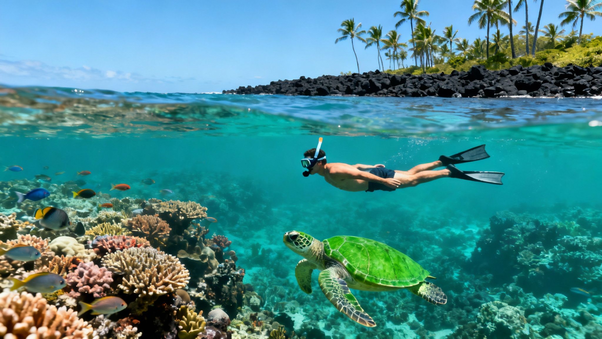 Welcome to your ultimate guide for snorkeling the Big Island. This place is truly special, and it all starts with the unique geology of the Kona coast. Millennia of volcanic activity created a dramatic, rugged coastline of lava rock, which in turn formed countless natural coves and bays. These formations are a snorkeler's best friend—they act as a natural shield against the big ocean swells, creating calm, protected sanctuaries where sea life can absolutely flourish.
