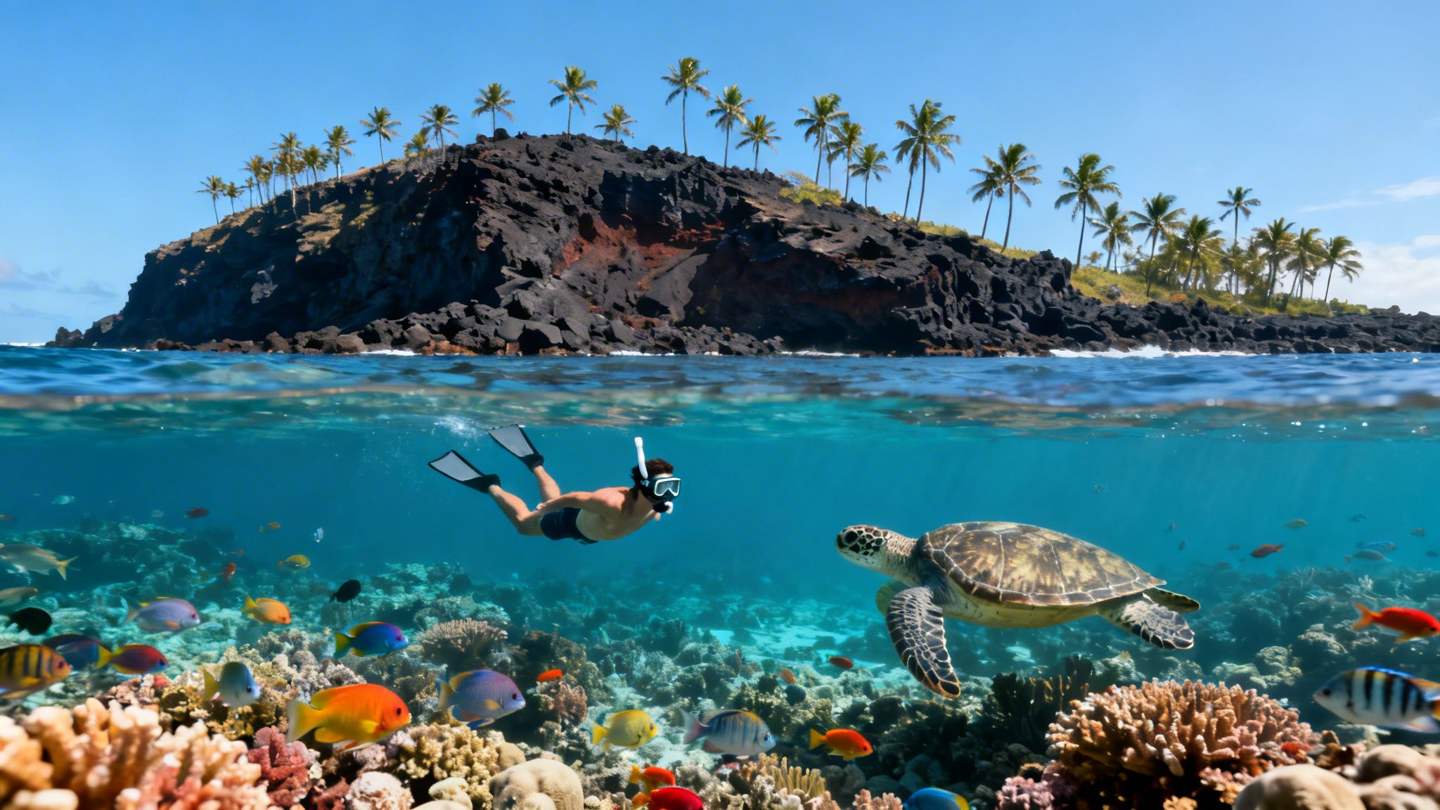- Iconic Marine Life: This is one of the most reliable places on Earth to swim with Hawaiian green sea turtles (honu), spot pods of spinner dolphins, and get lost in clouds of hundreds of species of colorful reef fish.